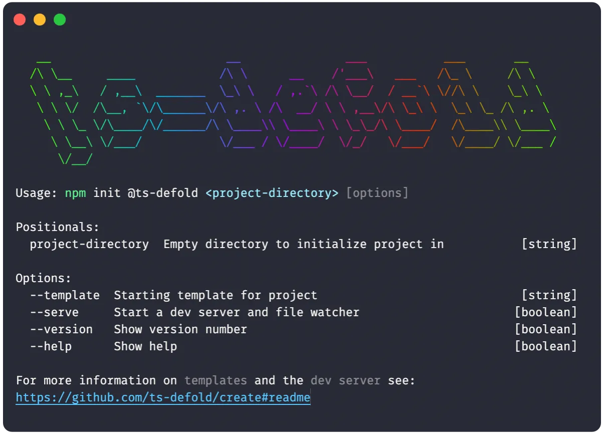 ts-defold/create is the official project generator for the ts-defold ecosystem — a single command that scaffolds a fully configured Defold game project with TypeScript support ready to go. Running npm init @ts-defold <project-directory> pulls down a template, wires up the TypeScript toolchain, and drops you into a working game project in seconds. No manual config, no hunting down type definitions, no fighting with the build pipeline.